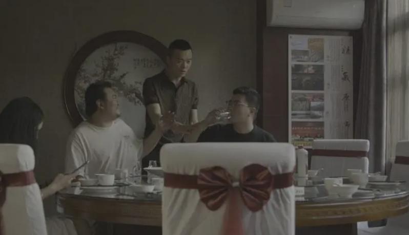 南:其实这场戏我没有说有意的要延长一个尴尬,当时我到了寿司店以后,第二个镜头本来准备周五拍了,结果我们从山上下来午餐都已经变成晚上了。在这样的一个环境里面,我觉得这家店很有意思,还有一个寿司的招牌,寿司做出来是挺热乎的,我没有见过现成的这种日料是这样的,觉得很有意思。我一直在考虑我将怎么去拍,不知道怎么拍才能拍到他招牌,我又不想单独分切一个镜头,所以说走两步的话可能会好一些。但是你不能光让人看一个牌子,包括我一转身后边的关窗户,关窗户的节奏其实也不太对,但是拍的变数实在太多了,太疲惫了。当时我很长时间,其实第一个镜头也是能过的理由,也就是石头撞到了树。我是很想拍好一个电影,但是我也会考虑到预算也不会兼容,我不能说不满意了,这反正是个很纠结的问题,但是这无所谓。尴尬延长了,我倒没有考虑,我只是坐在监视器器之前看的时候,我只想感受到我的表演,就是这俩人走了,我到底以什么样的面貌去往前走进去,没有别的想法。