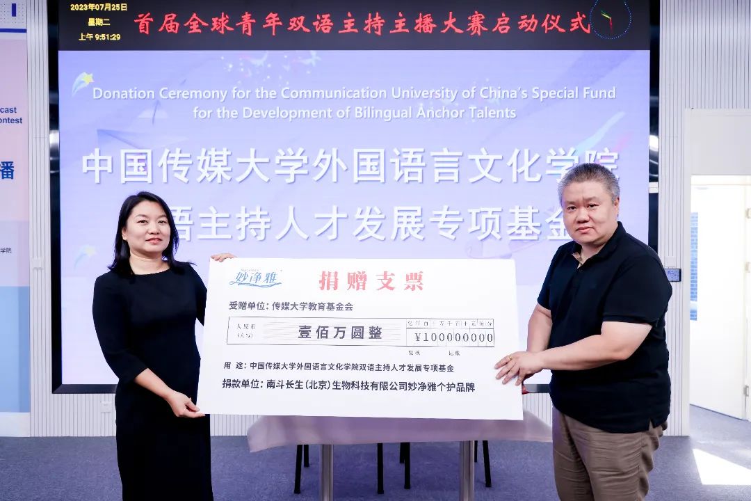 启动仪式上,中国传媒大学双语主持人才发展专项基金捐赠仪式举行。该基金由南斗长生(北京)生物科技有限公司向传媒大学公益基金会捐赠,资金将用于支持双语主持人才培养、课程建设、实习实践、对外交流、学术研究、实验室建设等方面。