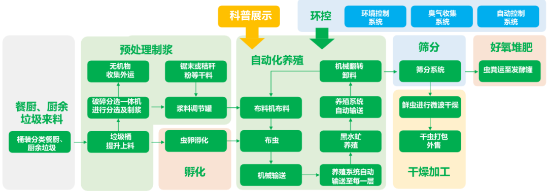 华中农业大学张吉斌教授课题组研究得出:我国每年产生的餐厨垃圾已超过1.1亿吨,在餐厨处置(焚烧、厌氧、好氧、黑水虻)主要工艺中,黑水虻技术利用昆虫能高效摄食粪污转化成自身生物质的特点,能获得高脂肪、高蛋白的昆虫生物质,从而有效减少碳的流失,而被固定于虫体生物质中。