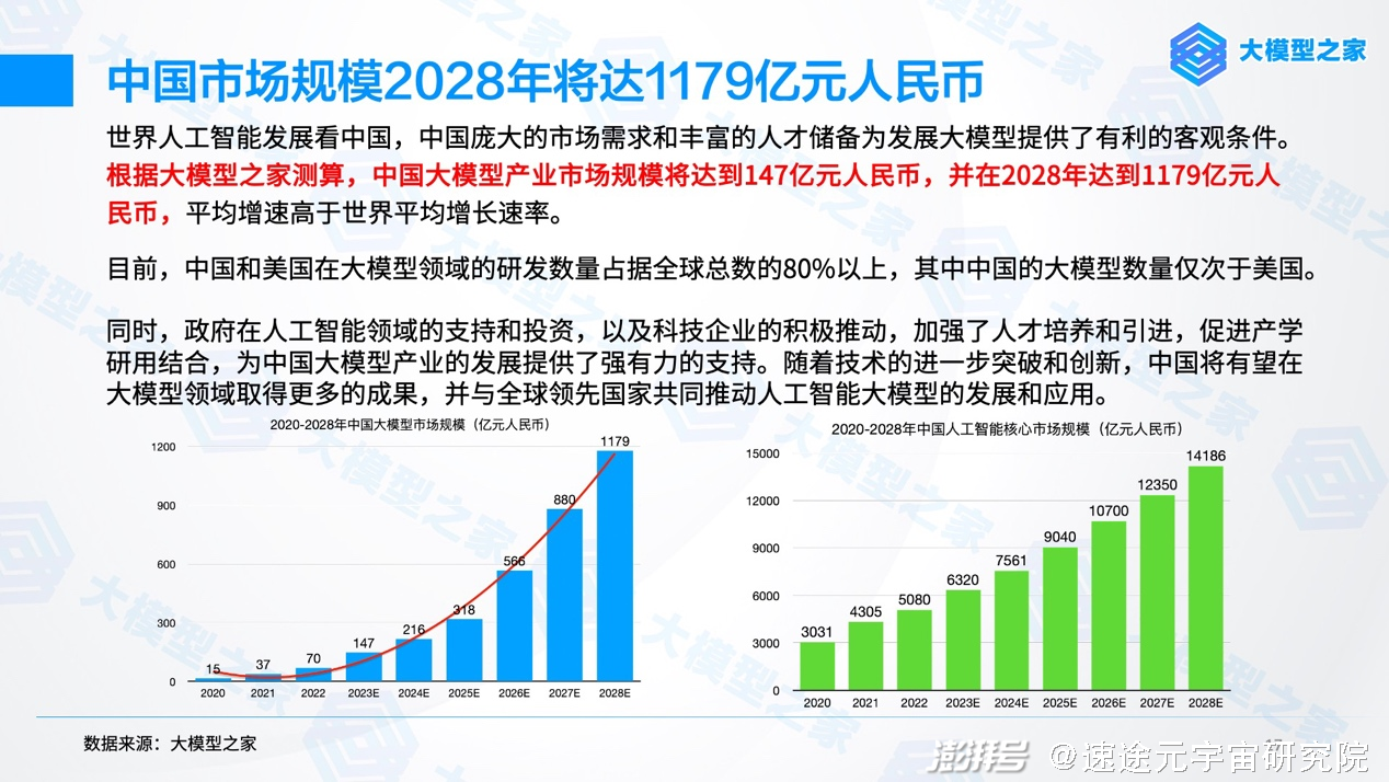 日前,速途网联合国内AI大模型前沿媒体大模型之家,及速途元宇宙研究院专业分析师团队联合发布了《AI大模型产业创新价值研究报告》,全方位展现了AI时代大模型前沿趋势,解构大模型在产业侧的创新价值。市场前景广阔,中国大模型产业市场规模2028年将达1179亿元