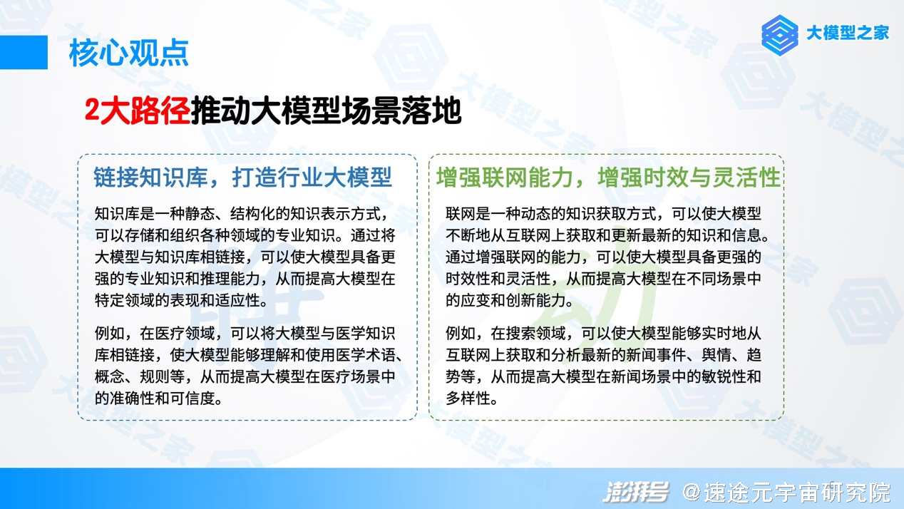 《报告》还结合当下大模型产业发展格局指出现阶段大模型落地的两大路径。针对不同行业的场景特点,进行有针对性的知识增强在解决现阶段问题中发挥着重要作用。通过链接知识库进行专业知识增强,打造行业大模型,或是通过增强联网的能力实时扩充大模型知识储备,大模型能够深入了解各个行业的专业知识,并将其融合到模型的学习和推理中。