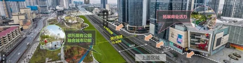 为实现“有机利用低效空间,缝合织补公园”的目标,设计提出将金牛大道临近商业段进行上盖,依托已建成的新金牛公园,延展商业界面,织补衔接、有机融合,解决了之前到达场地困难不安全的问题,实现公园与城市的无边界发展。主打多元链接+地标纽带