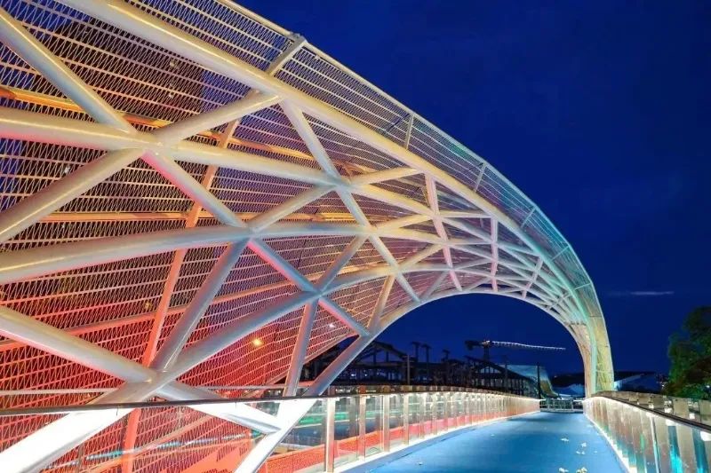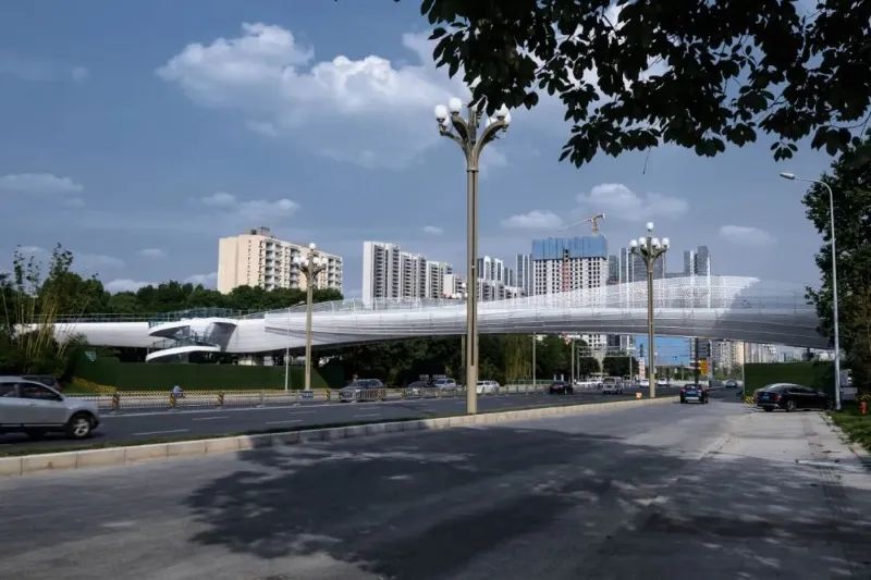 三座桥梁横跨了市政道路,串联了新金牛公园、金牛公园和天府艺术公园,既是慢行纽带,又是新兴文化地标。桥梁强调海绵城市绿色低碳的理念,选线充分利用和保留现状自然本底,尊重绿色生态价值,利用桥下空间设置休憩区域,将消极空间转化为积极空间。通过创新演绎,实践文化传承