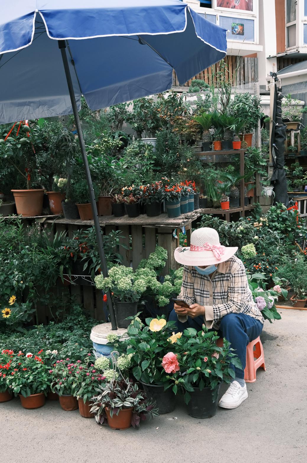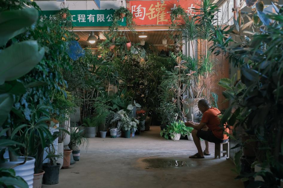 绿色是这里的主色调 —— 在几百盆花花草草中找老板,是花鸟市场顾客们的日常操作。