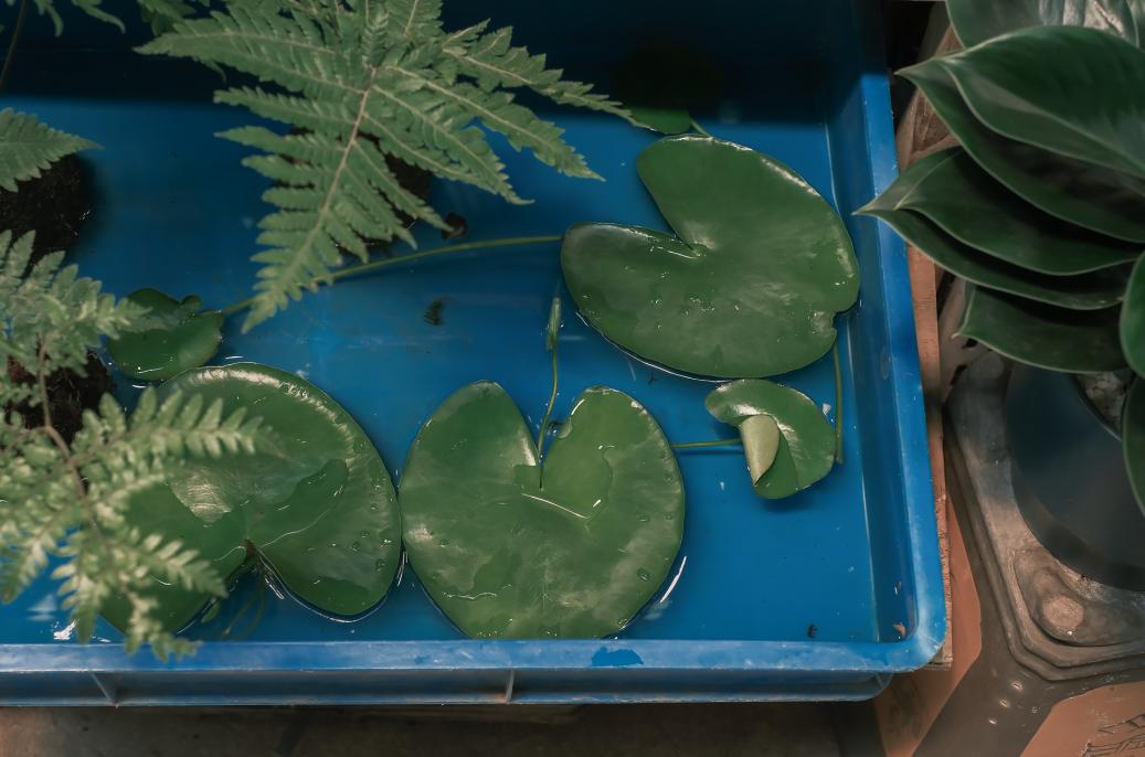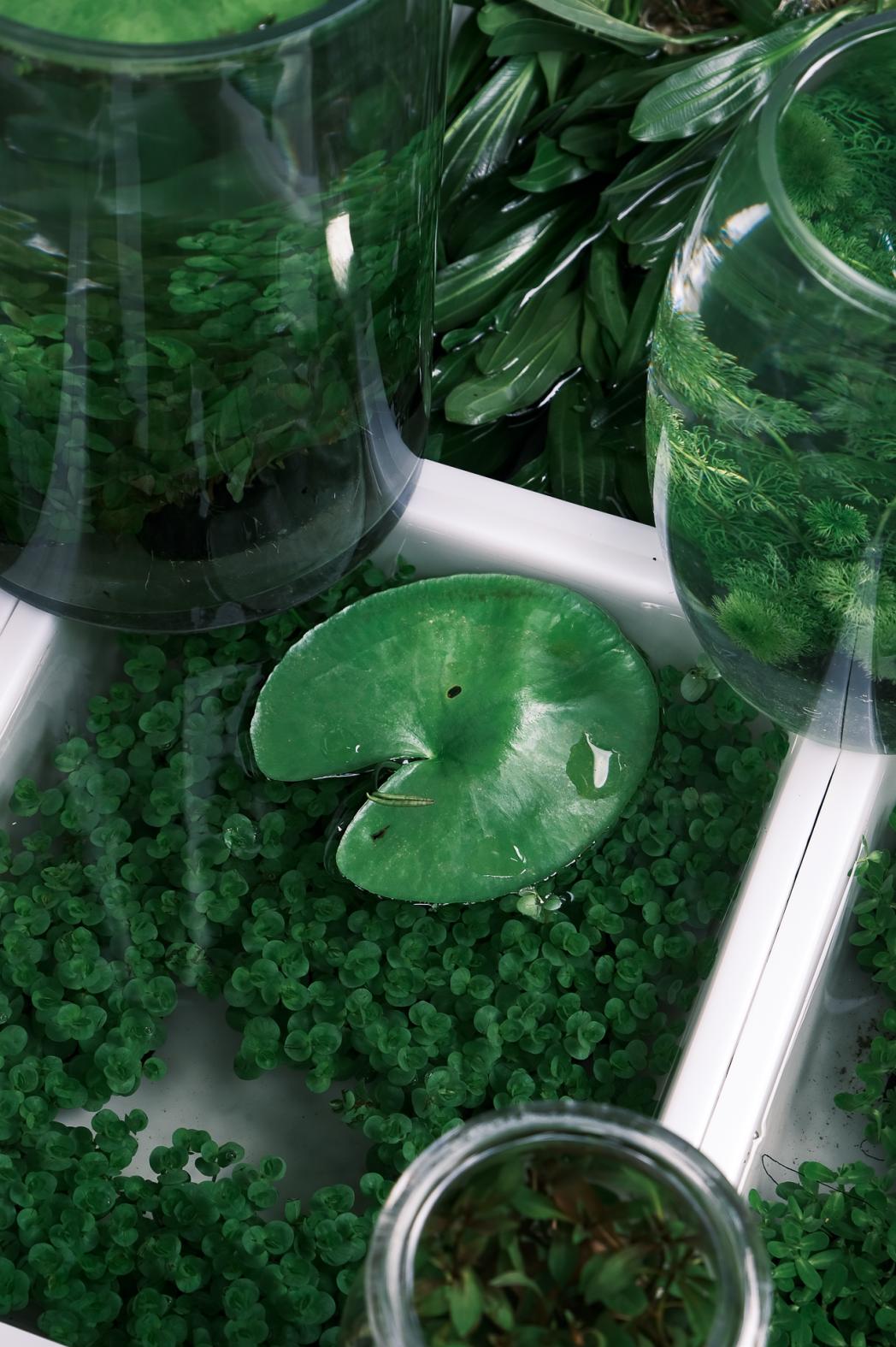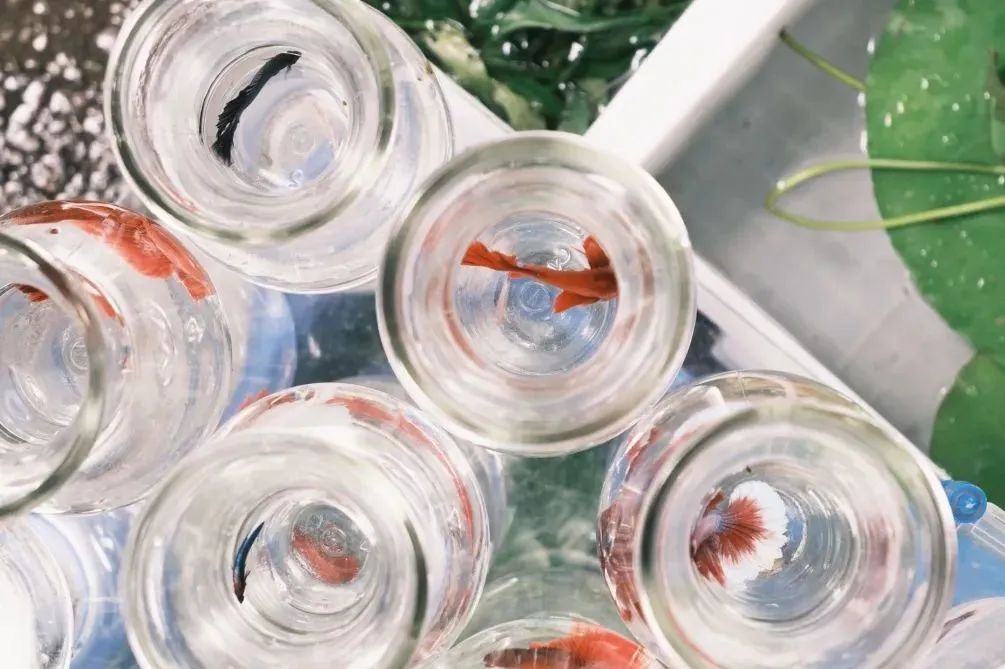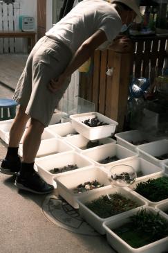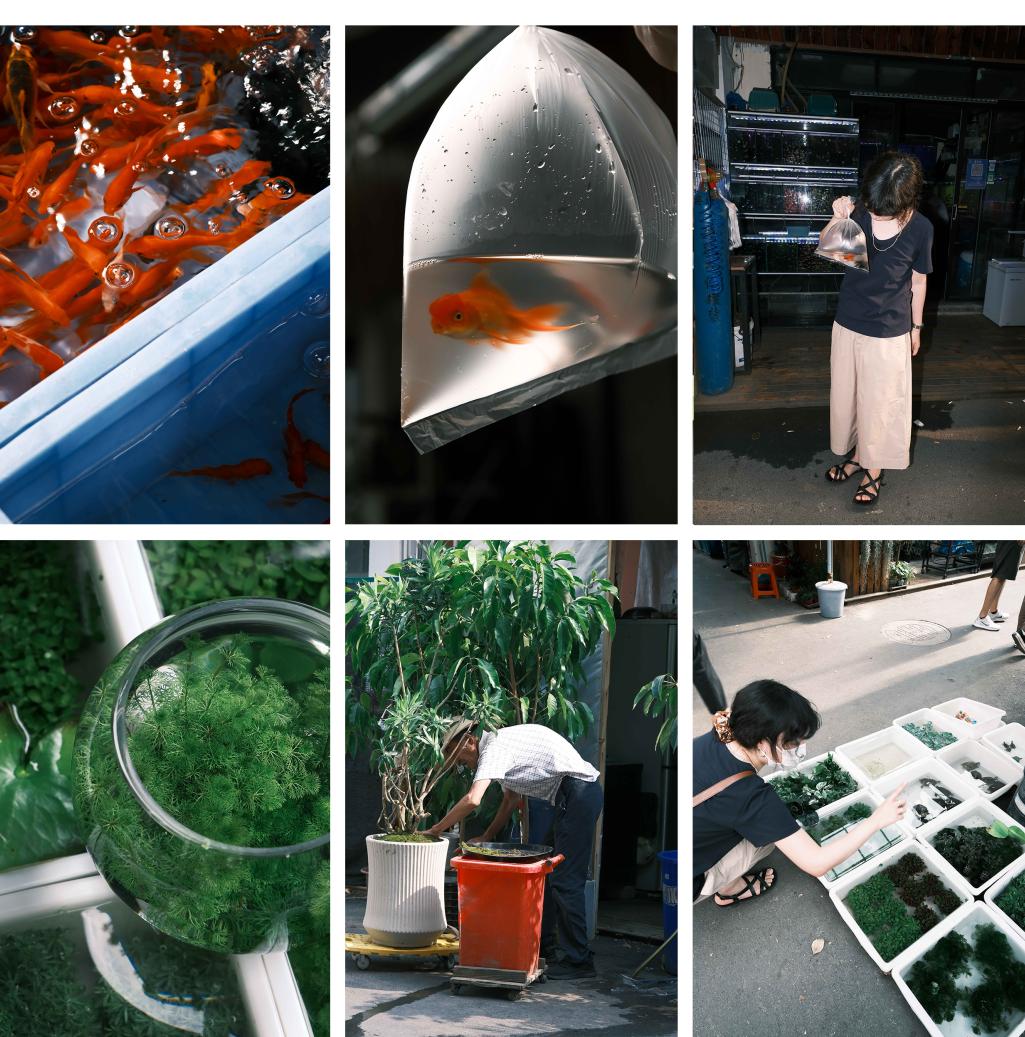 卖鱼缸置景的老板,整整齐齐码出了一盆盆“沙拉“,夏日的蓝天白云,变成了盆里的“海”。