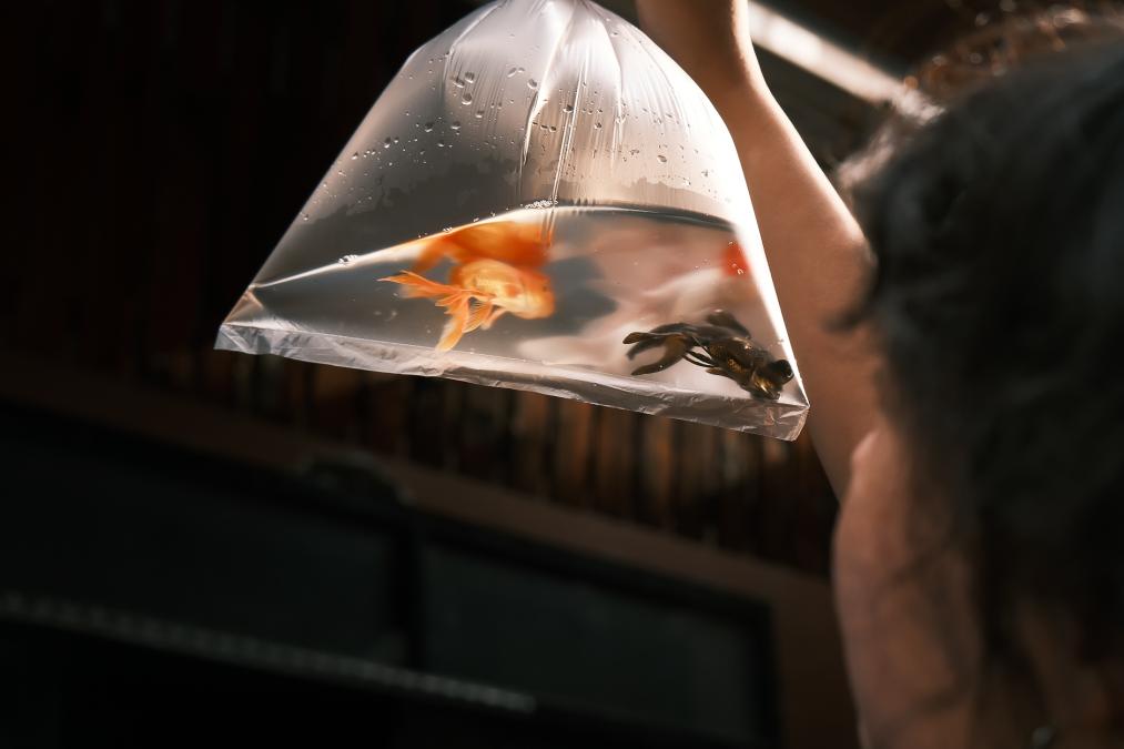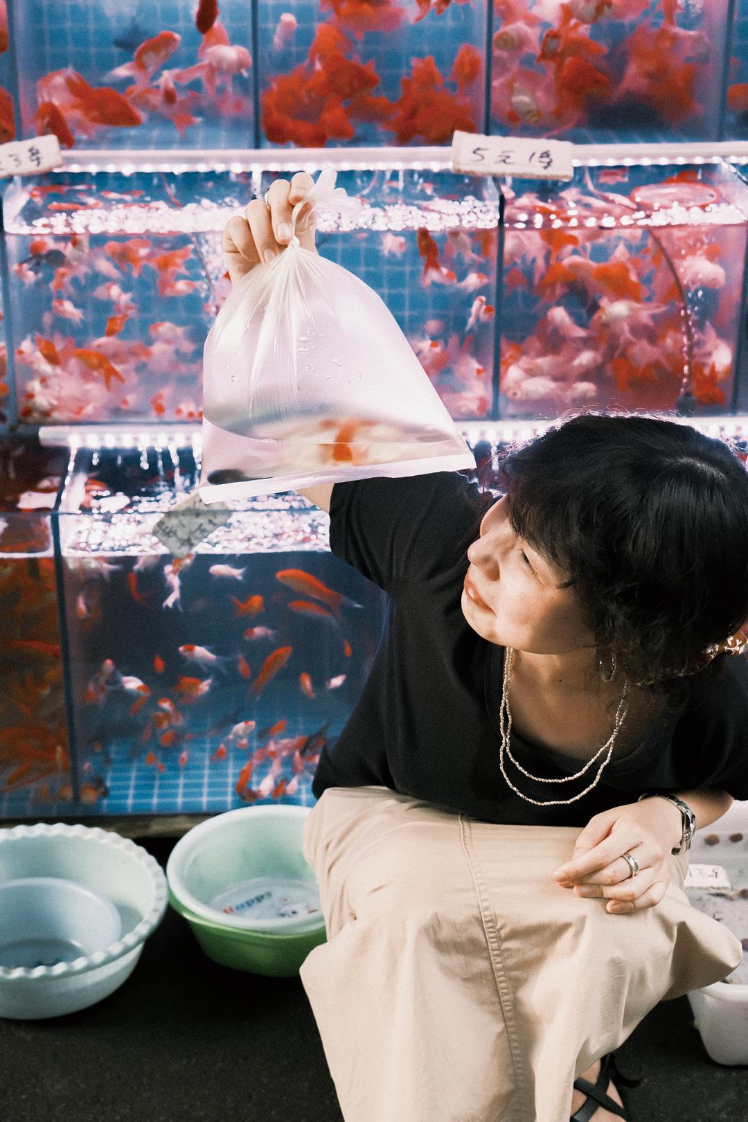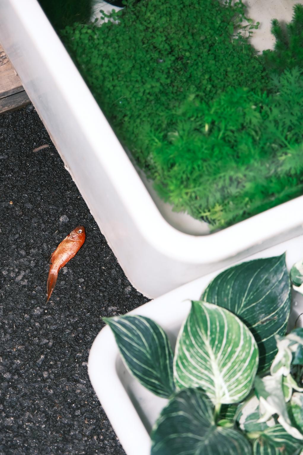 鱼缸下方非常有年代感的小脸盆,可以随便捡来用,技术不到家/对小金鱼颜值没有执念可以呼叫眼疾手快的老板,分分钟给你搞定。「捞金鱼tips」