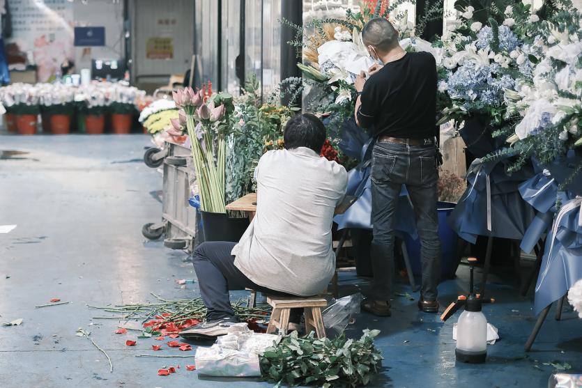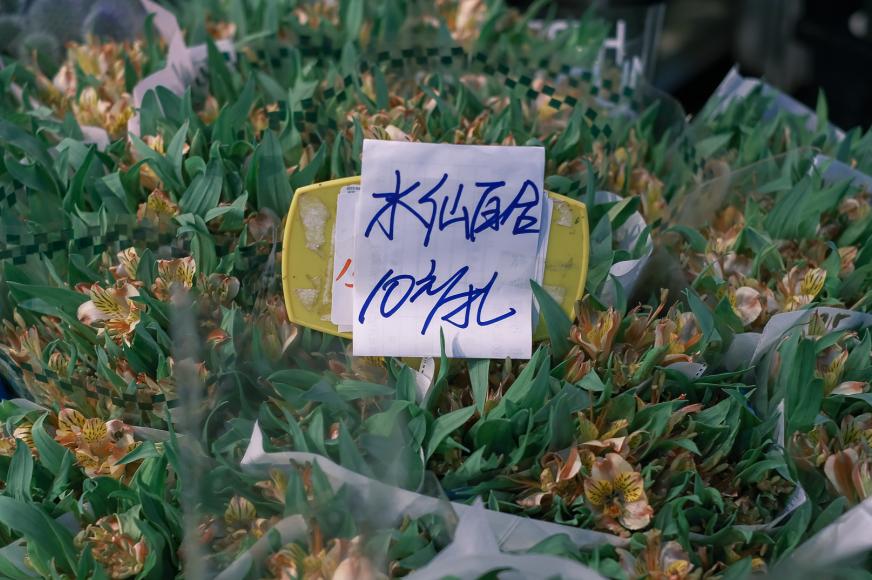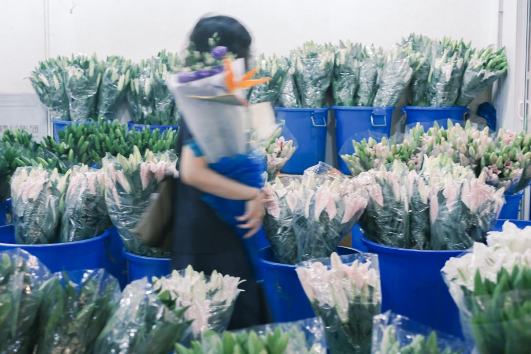 批发市场的鲜花不娇气,塑料桶、硬纸箱一装就地开卖。挑花,每个人都是“猴子捞月”标准姿势,大大咧咧的模样就是逛市场最大的乐趣。