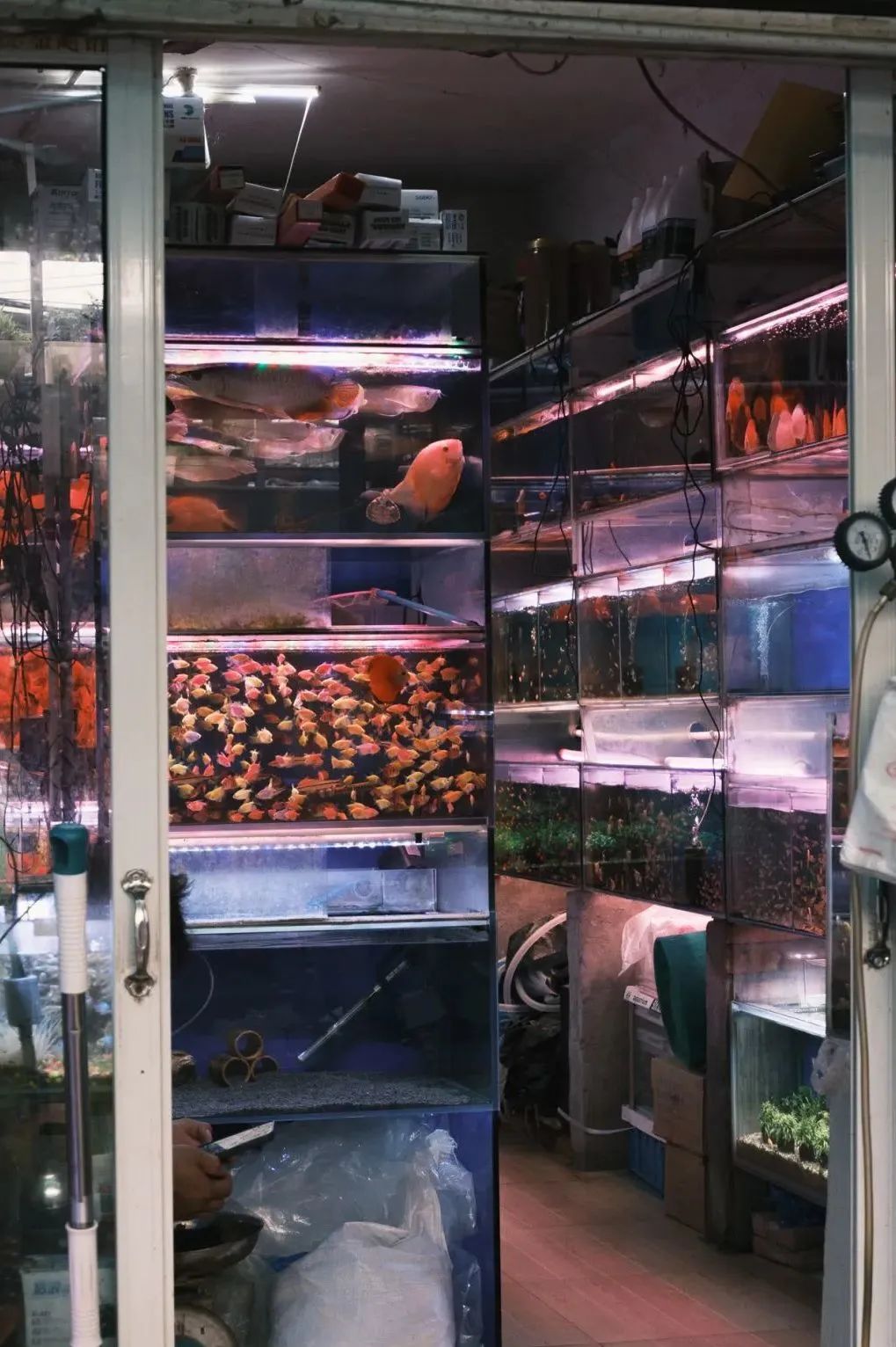 这里简直就是把一个迷你水族馆搬来了,鱼缸都是三四层往上垒。鱼的种类众多,热带鱼、锦鲤、金鱼、龙鱼等,还有龟类蟹类两栖水族生物。