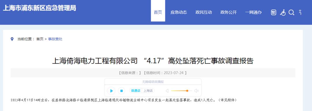 7月24日,上海市浦东新区应急管理局发布了《上海倚海电力工程有限公司 “4.17”高处坠落死亡事故调查报告》。现场勘查调查情况