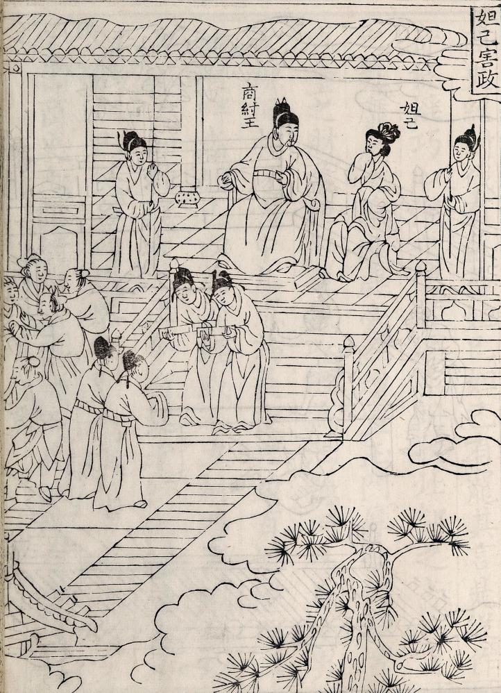 《妲己害政》(局部)。来源/(明)张居正编《帝鉴图说》第四册,纯忠堂藏板,清中期刊本“不任用亲族”和“收容任用罪人”实际上是同一问题的两面。所谓的罪人主要是各属国的逃奴,奴隶在商朝受到重用是其尚贤政治特色,如商汤的贤相伊尹本是有莘氏女之私臣,武丁之相傅说也是擢拔于奴隶之中。纣王此举,原意是要与各属国争夺奴隶,与后来的春秋战国时期各国竞相招徕他国民众如出一辙,都是为了增殖人口、便于生产以发展本国经济。需要注意的是,商朝时期的“百姓”指的是贵族,所谓的罪人残害百姓,实际上是对旧贵族利益的损害。外来的新鲜血液充实到政治领域中时势必会带来一些变革,对保守的旧贵族的政治空间与传统利益势必有所挤占,加剧了统治阶级内部的矛盾。而纣王此举对外而言,不无损人利己之嫌,难免会引起各属国的怨恨。周文王则反其道而行之,下令“有亡荒阅”,大搜逃奴交还本主,使商朝的大批属国转而倒向周,这也是周能得天下的重要原因。
