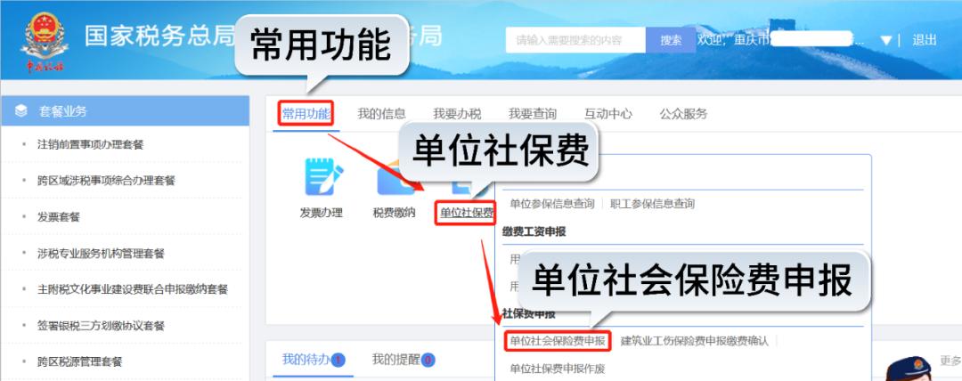在首页【常用功能】模块,依次点击【单位社保费】-【单位社会保险费申报】,勾选待申报数据,核对待申报信息,确认无误后点击【申报】,申报成功后在【单位社保费扣款】模块缴纳费款。