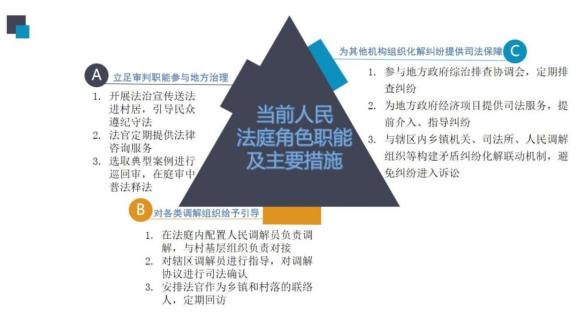 最高人民法院于2014年召开的第三次全国人民法庭工作会议出台了《关于进一步加强新形势下人民法庭工作的若干意见》,其中它用一章节的内容为人民法庭列出了其参与基层社会治理的“角色清单”,该“清单”对人民法庭在参与基层社会治理中实现治理法治化、现代化、规范化有三个方面的显著要求:一是要参与到县域治理最广泛主体之中,这不仅包括公安、司法等其他机构和人民调解委员会、村(居)民委员会等各类调解组织,也包括地方党委、人大、政府及其他相关部门,甚至包括普通公众;二是参与县域治理的方式要多元,既要对其他纠纷化解机构的进行示范指导、沟通协作、尊重支持,也要有引导普通公众的法治宣传,还要有对当地党委的专项汇报以及对政府及其部门的司法建议等;三是参与县域治理承担的责任要多元,除了立足审判职能,指导、协调各类组织化解矛盾纠纷外,在“四个治理”中要发挥桥梁纽带作用,实现诉非衔接、治理法治化水平提升、基层社会秩序有序目标。可见,人民法庭需要“主动、积极”去参与县域治理,但其并不是单一抑或全部主体。