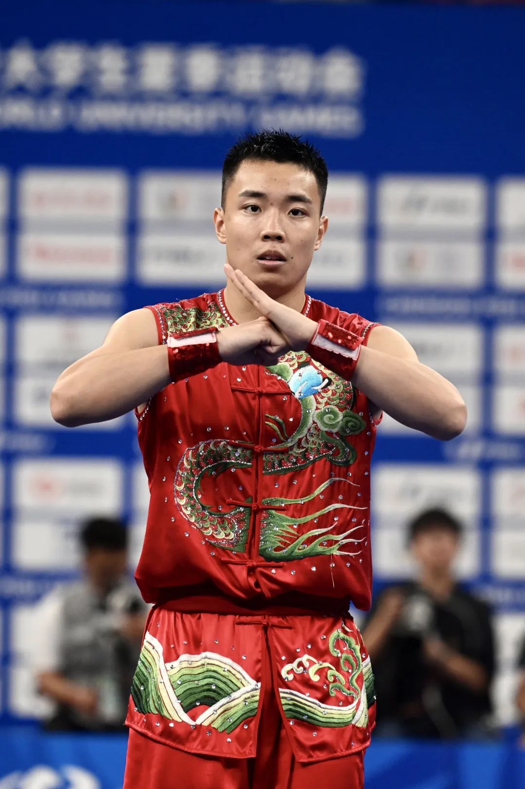 ↑中国大学生体育代表团正式成立时曹茂园作为运动员代表宣誓成都第31届世界大学生夏季运动会,是曹茂园运动生涯第一次参加国际赛事,在国内选拔赛上拿下男子南拳和南棍两项冠军的他,志在家门口夺金。为此,他的父母早早订了票。由于儿子每次比赛她都很紧张,唐蓉一度很犹豫,是否去现场见证儿子这一人生重要时刻。最终,他们决定去现场,一同前往的还有桓进威,以及曹茂园的师兄弟、同学和朋友们,一共30多人。