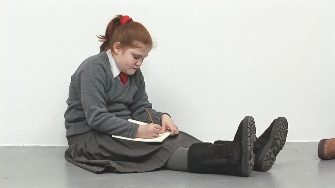 迪克斯特拉多次表示,她对模特的指导很少,希望让他们自然地展现自己。然而,并非每个人都能够引导出她模特的个性或自然表现。例如,在视频《露丝画毕加索》(Ruth Drawing Picasso,2009年)中,一个九岁的女孩坐在博物馆的地板上,画着现代主义画家毕加索声名狼藉的作品《哭泣的女人》(The Weeping Woman ,1937年)。在整整六分钟的时间里,摄像机一直保持在地面水平,聚焦在露丝身上,她试图重新创作这幅画作。她全神贯注地画画,她悠哉地哼着歌,她犹豫不决,她把一支蜡笔递给坐在镜头外地板上的同学。在她工作时,这个年轻女孩的坚定性格在她的面部表情中显露出来;当视频开始循环播放时,我因她的迷人表现而微笑。然而,在某个时刻,我不禁想知道她完全自然的专注是否来源于她知道自己正在被拍摄。法国电影制片人罗伯特·布列松(Robert Bresson)写道:“生活不能通过生活的摄影复制来表现,而是通过其中的秘密法则,你可以感受到你的模特在其中移动。”模特的自我意识并不会让肖像感觉不够自然,而是成为他们性格传达的媒介。在一种俏皮的姿态中,露丝绘制的《哭泣的女人》被展示在博物馆走廊的玻璃橱窗中,与放映室相邻。上面标有标题、日期、签名和题词:“献给莱涅克。”