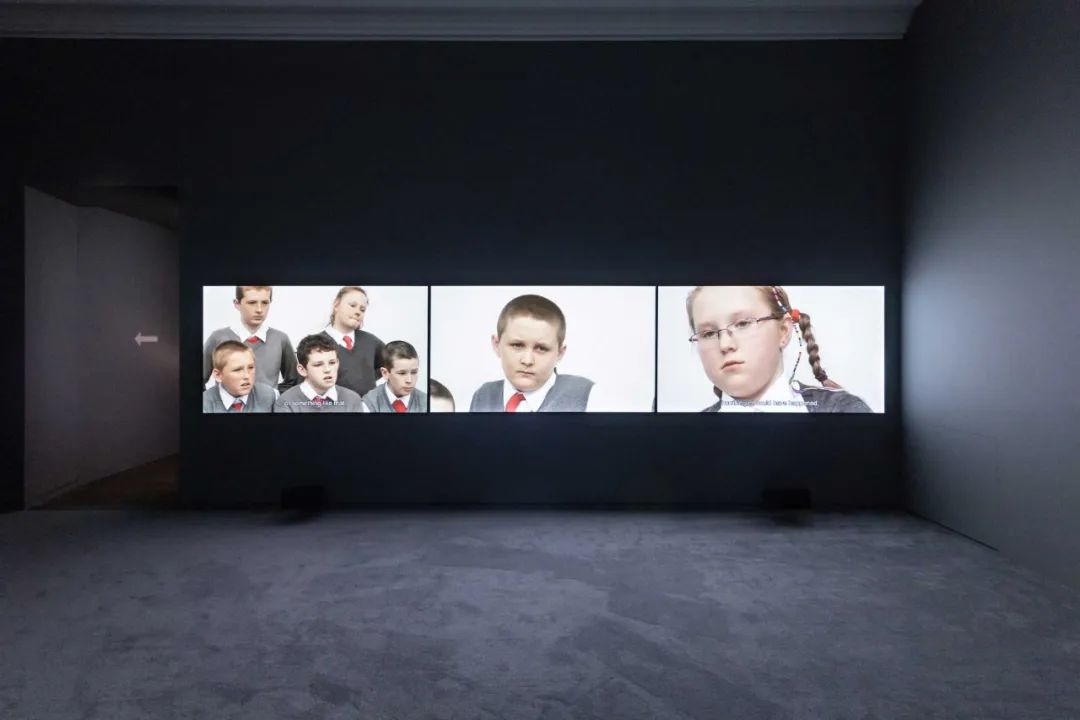 莱涅克·迪克斯特拉的作品《我看到一个女人哭泣(哭泣的女人)》(2009年)在巴黎欧洲摄影之家(MEP)的展览场景,摄影:Quentin Chevrier,摄于2023年。在视频作品《我看见一个女人哭泣(哭泣的女人)》(I See a Woman Crying (Weeping Woman),2009年),这是一个由三个屏幕组成的视频,与《露丝画毕加索》形成了一种连环对联。一群身着相同制服的学童注视着毕加索的《哭泣的女人》,而画作则再次超出迪克斯特拉的镜头范围。孩子们描述这幅画,并讨论他们认为画作表达的意思:她经历了什么,为什么在哭泣。他们的回答涵盖了家庭问题的想象,关于视频游戏和金钱的幻想,这些回答既迷人又有趣,有时还令人心碎。这成为了一种批评性的集体作品,从英格兰北部的孩子们的视角审视着那幅充满争议的多拉·马尔(Dora Maar)的肖像画,他们显然享受着表达自己观点的乐趣。