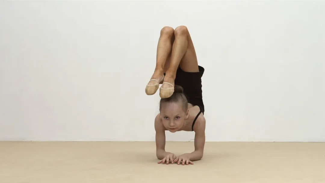 莱涅克·迪克斯特拉的作品《伊娃,体操学校》(2014年)的静帧。在最后的三通道视频《体操学校》(Gymschool)中,一组年龄在八至十二岁之间的年轻女孩在圣彼得堡的“珍珠奥林匹克学校(Zhemchuzhina Olympic School)”练习一种特有的俄罗斯训练方式,将体操、身体柔韧性和芭蕾融为一体。这些女孩展示了不同的成就水平。在视频开始时,年纪较小的孩子们学习一些动作,有时会借助一些道具,比如球,而年长的孩子们则已经掌握了每一个身体柔韧动作,并能毫不费力地进行练习。虽然她们没有像之前的照片中那样直视着镜头,但她们似乎为展示自己的成就感到自豪。随着视频的结束,年龄最大的体操运动员完成了一个看似不可能的柔韧动作。她的目光从镜头前经过,落在远处。她轻轻地笑了笑。