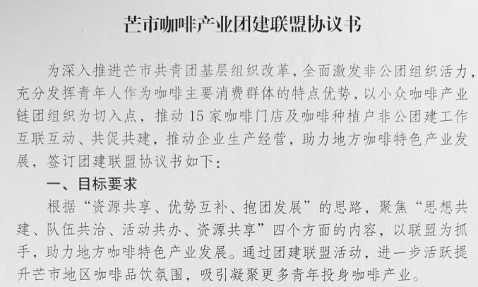 受发展规模限制,芒市咖啡企业从业人员“少”、“散”问题较为普遍,如何把咖啡产业链上种植、加工、销售及门店经营不同环节的从业青年聚集到一起呢?共青团芒市委紧盯“改革组织设置和动员机制”举措,打破纵向产业链和横向不同企业限制,在符合建团条件的咖啡企业率先建立团组织,进一步动员15家咖啡门店及咖啡种植加工户联合组建芒市咖啡产业团建联盟,签署联盟协议,确定“团团陪伴 ‘啡’尝芒市”联盟品牌,达成“政治思想联抓、企业员工联管、团内活动联办、资源优势联享”联盟协议,选派2名团务工作熟、责任心强的团干担任团建联盟指导员,通过联盟示范带动,引导青年咖啡从业者们形成“资源共享、优势互补、抱团发展”的经营理念,为推动德宏咖啡产业有序发展打牢基础。培育“青咖”文化赋能产业发展