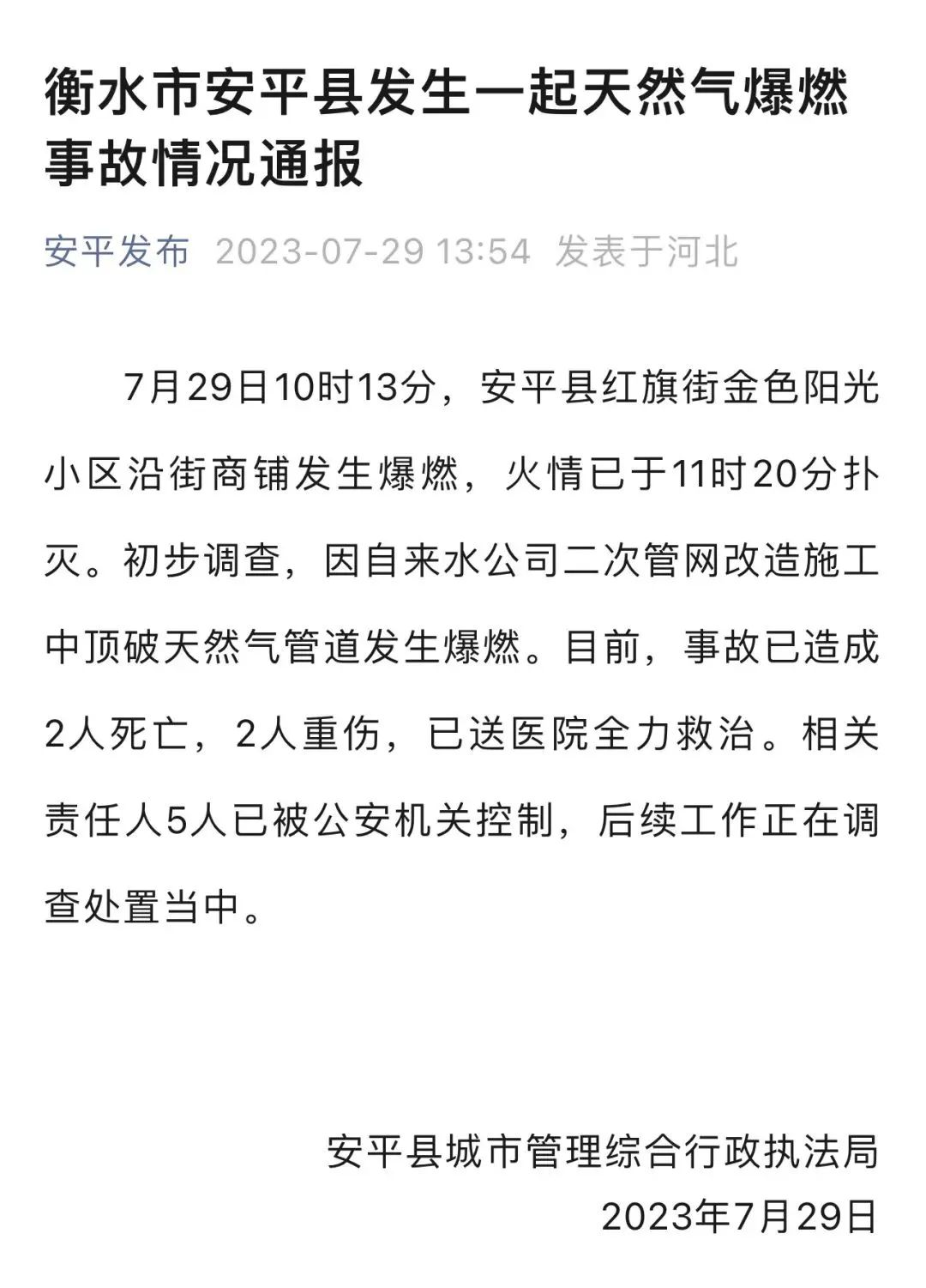 相关责任人5人已被公安机关控制