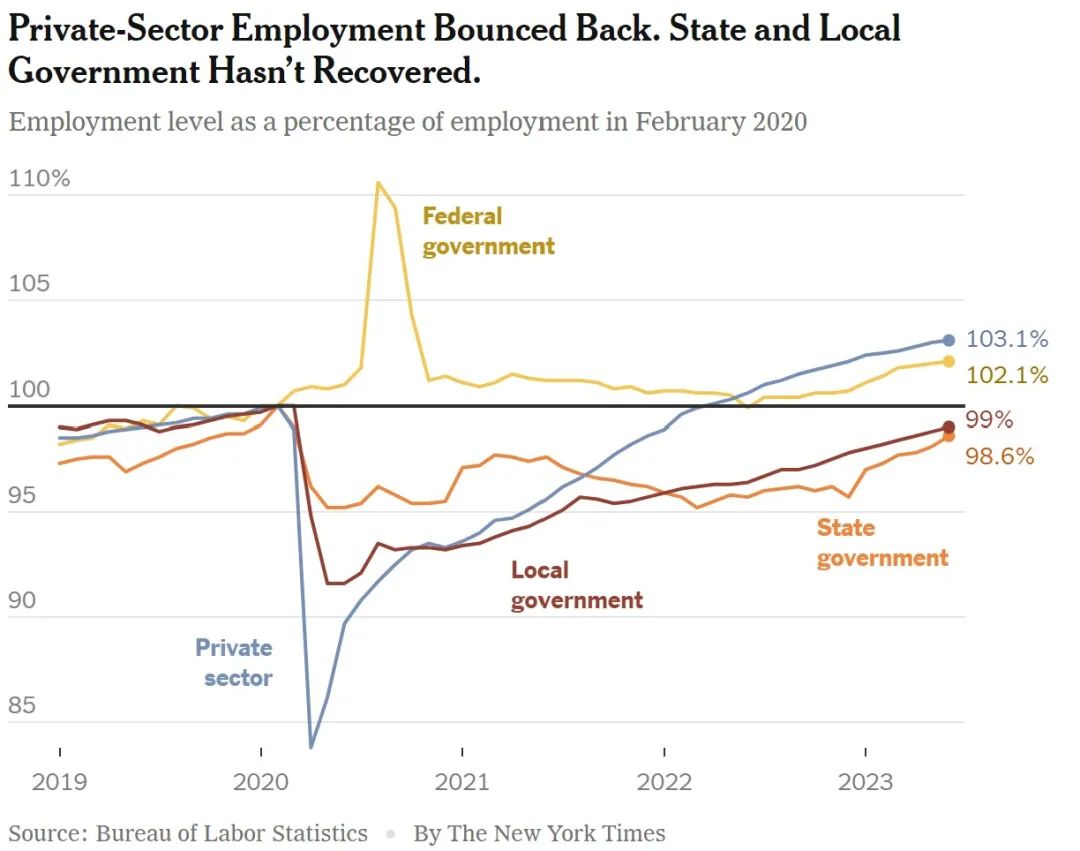 美国劳工统计局数据显示,目前美国私营企业的就业已完全恢复到疫情前水平,且还高出3%,但美国各州地方政府的就业人数仍比2020年2月的2000万人数少约1%。在美国劳工统计局追踪调查的十大经济部门中,公共部门是表现最差的,从2021年7月到2022年8月,每发布10个政府职位,只有大约4个职位能招到人。非营利研究组织Mission Square 6月发布的一项调查发现,超过一半的美国地方政府因缺乏足够的应聘者而不得不经常或频繁地重新启动招聘流程。在明尼苏达州,州政府职位空缺率从2019年的7.5%上升至2023年的11.5%。在爱达荷州,州监狱局和卫生福利局的职位空缺率分别高达20%和15%。