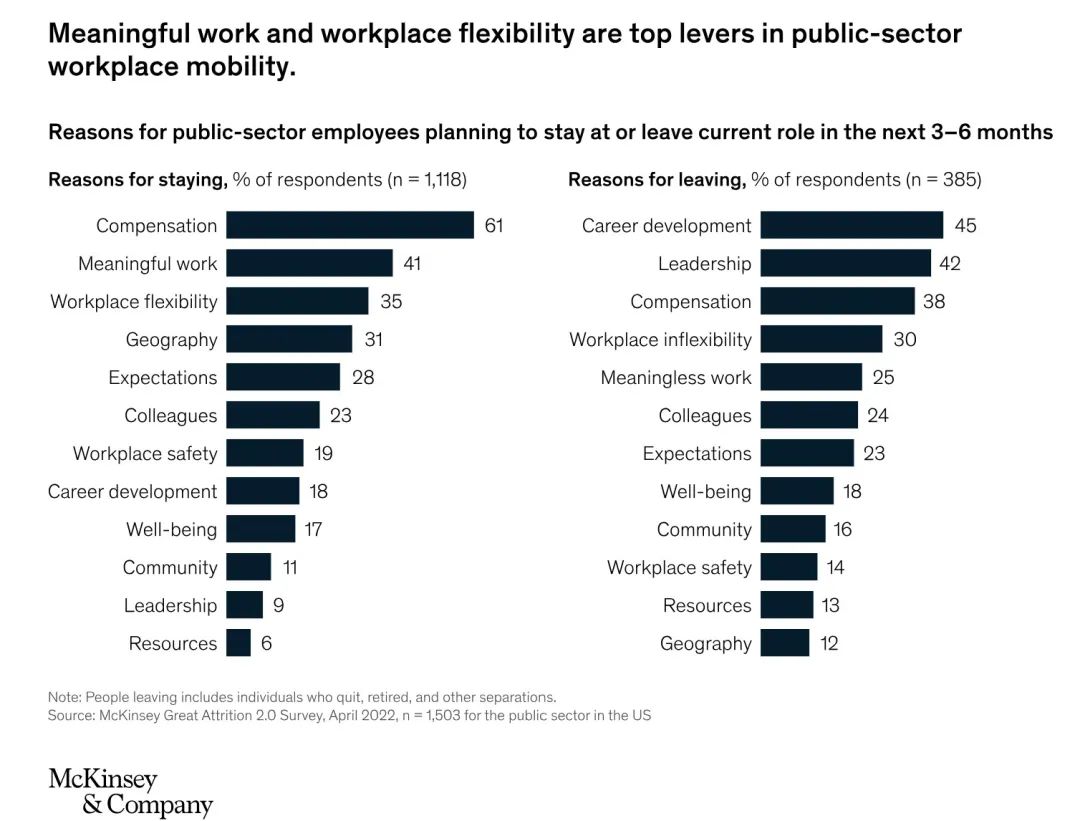 Mission Square 研究总监里夫卡·利斯-莱文森(Rivka Liss-Levinson)表示,人们通常会列出为政府工作的三个主要动机:工作保障、工作满意度和丰厚的退休福利。在招聘中传达相对慷慨的医疗保险和养老金等福利,并强调公共服务的使命感,这仍然是基本策略。“但随着时间的推移,这些事情并没有真正改变,能够真正解决求职者担忧的州和地方在招聘和挽留人才方面将会获得很大优势。”新闻来源:麦肯锡、纽约时报、Strixus,部分图片来源于网络