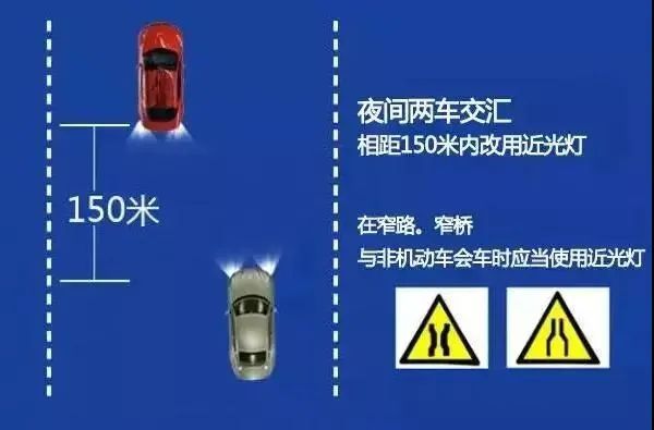 2、在没有中心隔离设施或者没有中心线的道路上,夜间会车应当在距相对方向来车150米以外改用近光灯,在窄路、窄桥与非机动车会车时应当使用近光灯。