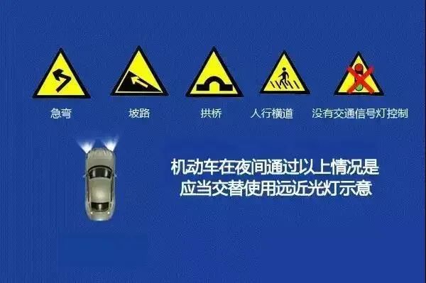5、机动车在夜间通过急弯、坡路、拱桥、人行横道或者没有交通信号灯控制的路口时,应当交替使用远、近光灯示意。