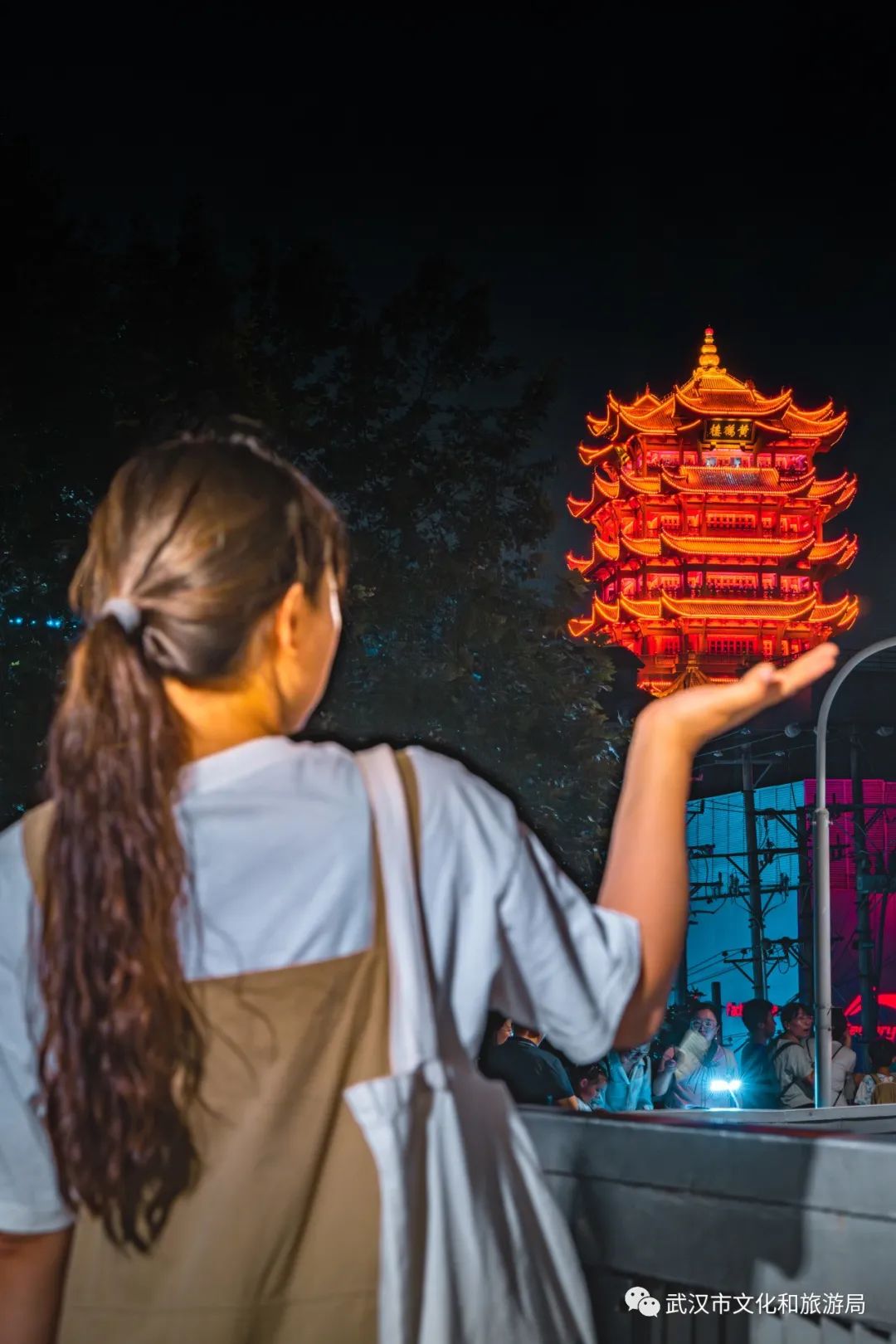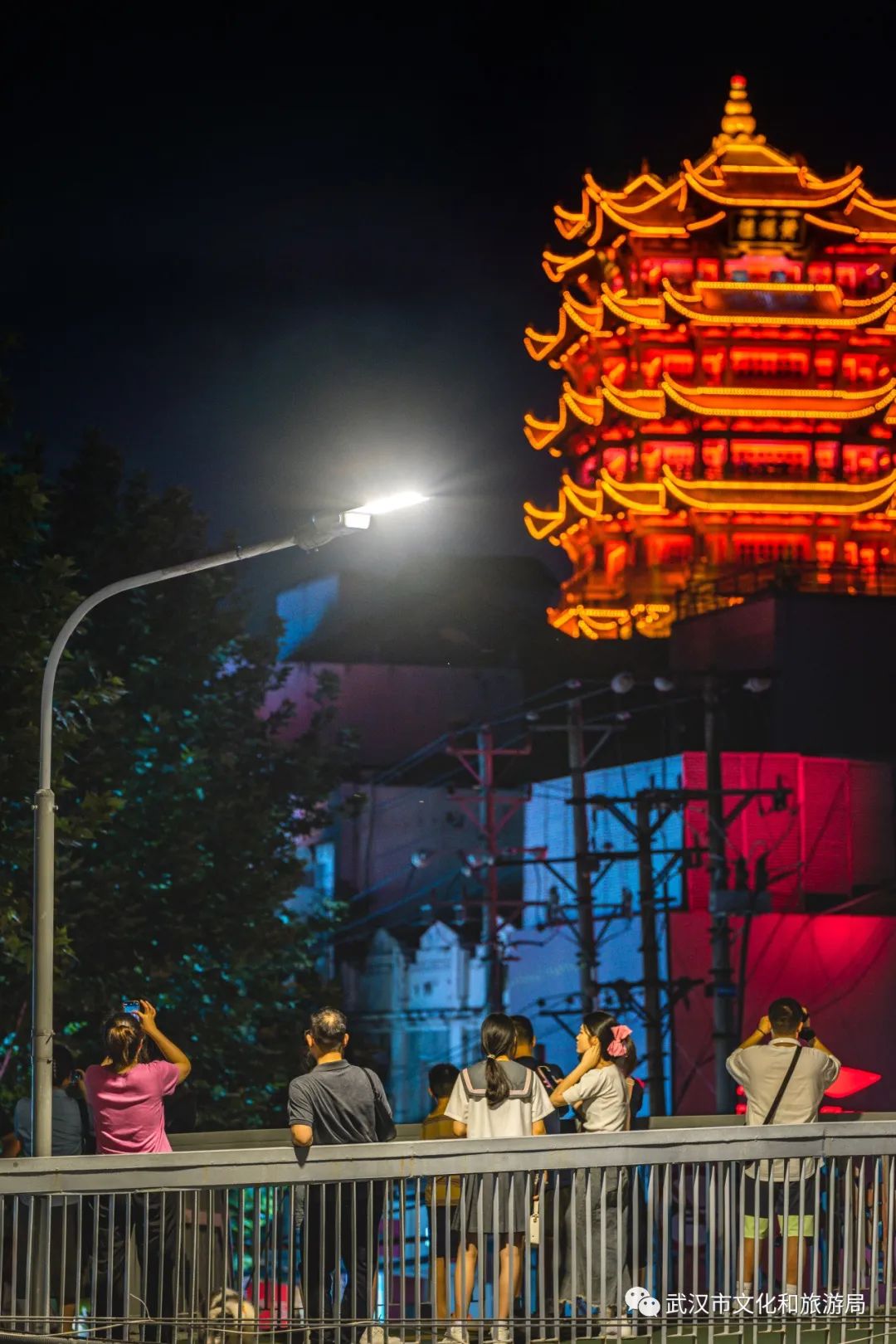 站在天桥上,能看到亮灯的黄鹤楼。会玩的人,已经学会用各种姿势,与名楼同框。