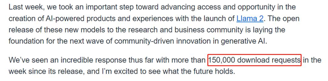 公布的测评结果显示,Llama 2 在包括推理、编码、精通性和知识测试等许多外部基准测试中都优于其他开源语言模型。不同于 ChatGPT、GPT-4 等闭源模型,由于 Llama 2 可用于商业目的,一经发布就吸引了一大波 AI 研究人员的注意。由于任何人都可以通过在 Meta 网站上填写表格来请求下载 Llama 2,根据官方消息,自发布以来,Llama 2 一周内就有超过 15 万次的下载请求。Meta 对于这一数字的描述是难以置信,并且用户请求数量还在增长。