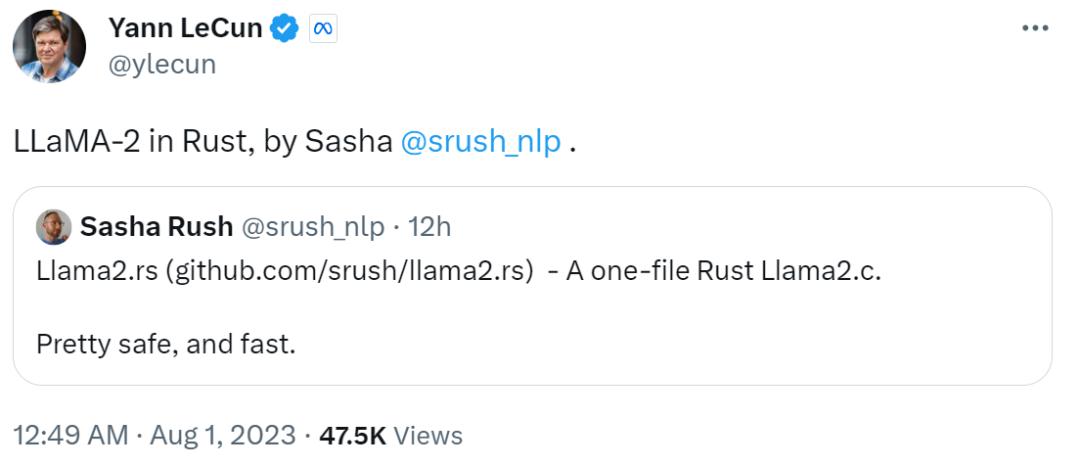 项目地址:https://github.com/srush/llama2.rs深度学习三巨头之一的 Yann LeCun 也宣传了一波: