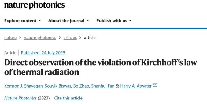 Shayegan, K.J., Biswas, S., Zhao, B. et al. Direct observation of the violation of Kirchhoff’s law of thermal radiation. Nat. Photon. (2023).