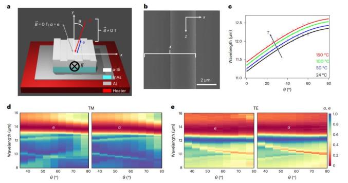 图1:耦合到n-砷化铟InAs 导膜共振guided-mode resonance,GMR结构的磁性可调发射和吸收的示意图,以及零场吸收率和发射率之间的比较。