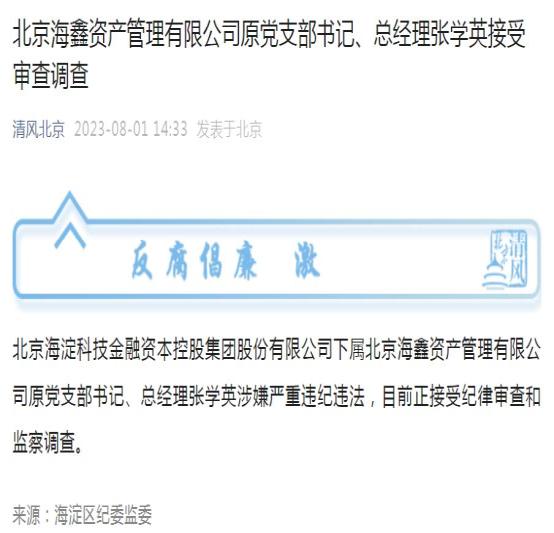 8月1日,“清风北京”微信公众号发布通报,北京海淀科技金融资本控股集团股份有限公司下属北京海鑫资产管理有限公司原党支部书记、总经理张学英涉嫌严重违纪违法,目前正接受纪律审查和监察调查。