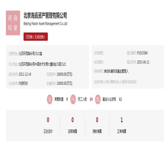 根据官网介绍,北京海鑫资产管理主营业务有资产投资、债权投资、增信业务、私募基金等板块,并具有私募基金管理人资格。不过,中国证券投资基金业协会官网显示,目前北京海鑫资产管理的私募基金管理人资格已主动注销。
