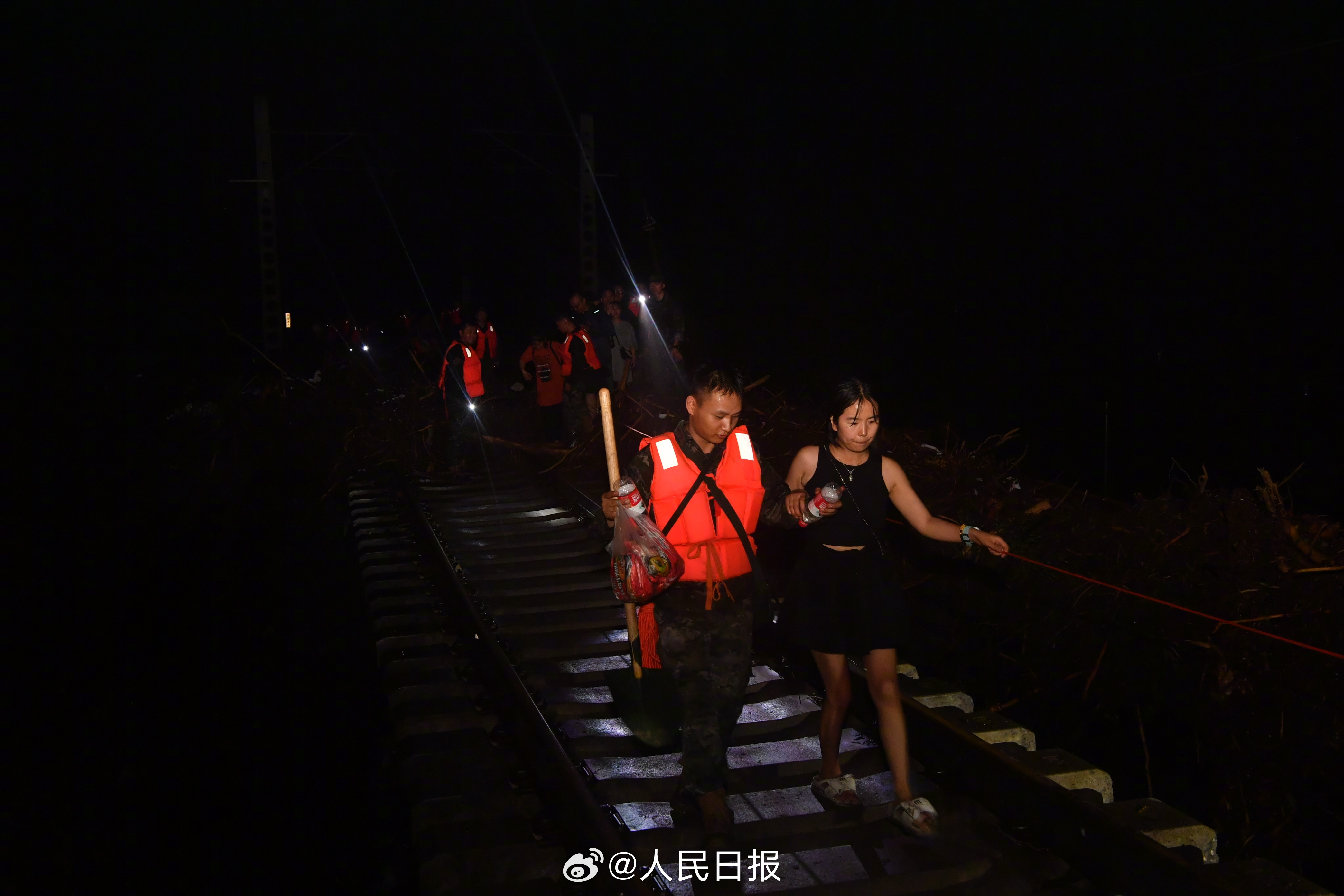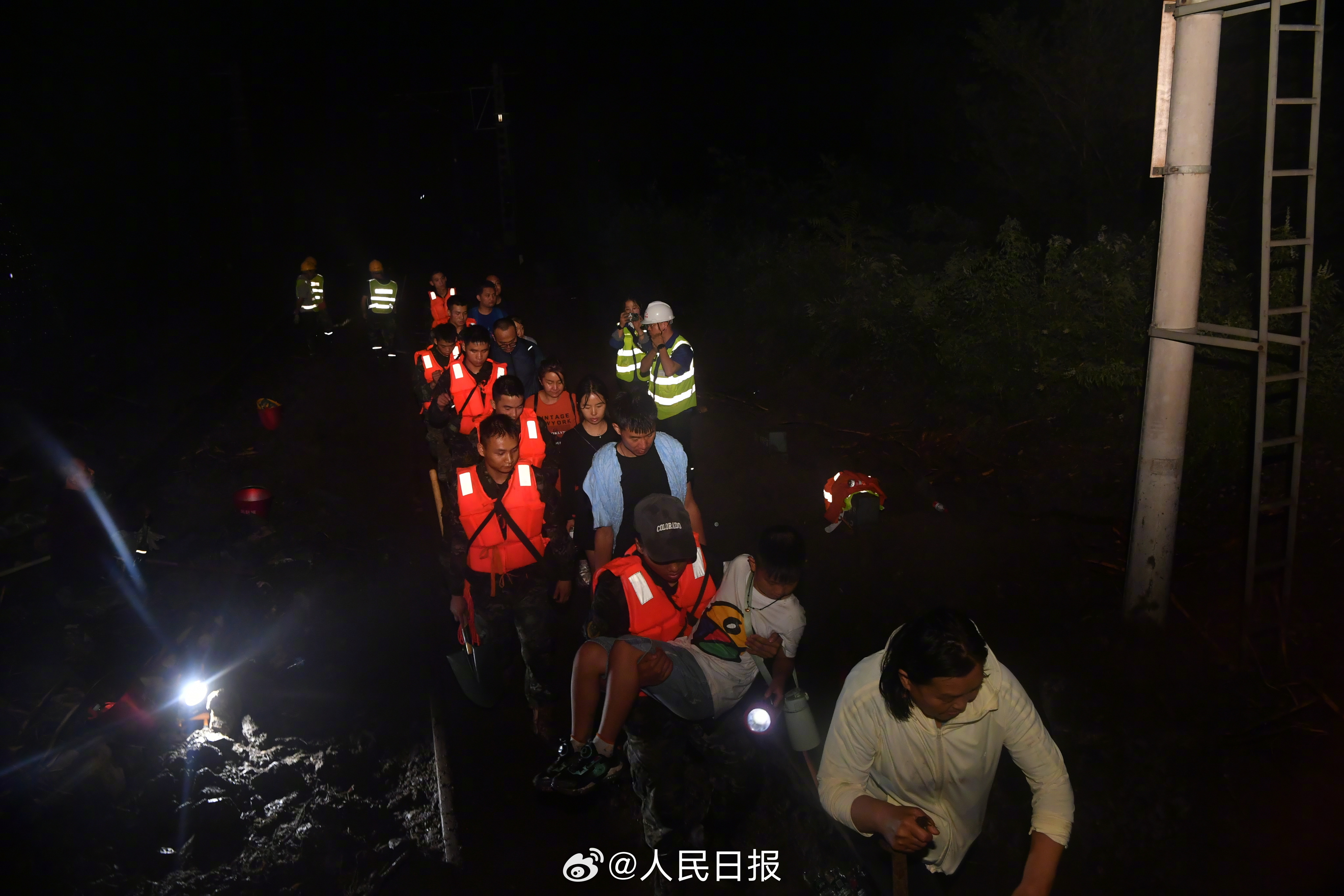 在武警队员的护送下,第一批旅客开始向山下转移,连夜步行前往斜河涧车站。@人民日报 图