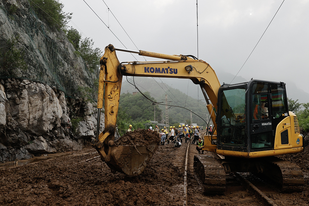 2023年8月1日,北京门头沟区,丰沙铁路妙峰山镇水峪嘴村段,工作人员和大型机械在铁路线上清淤。中新社记者 盛佳鹏 摄