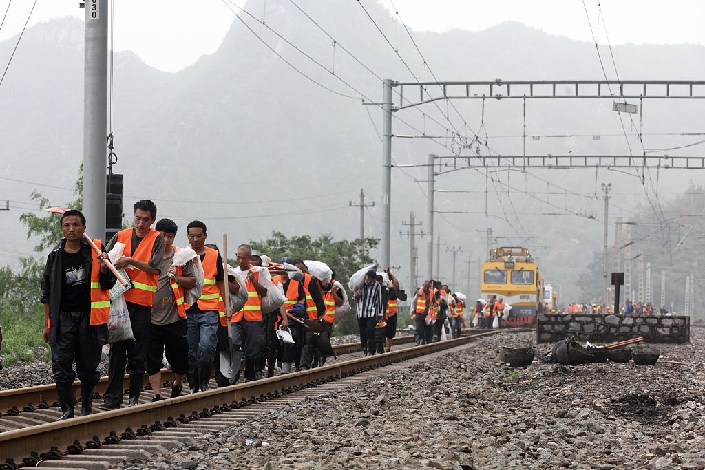 2023年8月1日,北京门头沟区,丰沙铁路妙峰山镇水峪嘴村段,工作人员前往铁路线清淤。中新社记者 盛佳鹏 摄