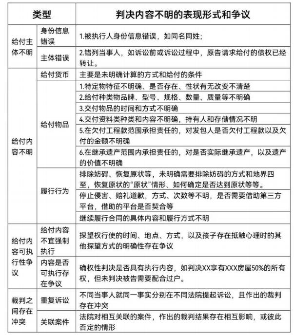 为了更直观的分析,笔者从前述检索的执行案例中选取了2021年的文书样本进行分析,根据主体、内容和争议点等进行了分类(见表1)。从查阅的案例看,以裁判不明的内容分类主要包括四种情形:一是主体不明或主体错误,如(2021)皖03执21号案,认为申请人在申请执行前已就案涉债权与XX公司签订了债权转让协议并登报公告,其已不具有申请执行人之主体资格;二是权利义务的客体不明,如(2019)渝0101执6083号案,执行标的系交付价值600万元的货物,但货物内容不明确;(2021)苏02执复40号,生效判决主文对自行取回材质为SPCC的精密方管23.24吨表述不具体不明确;三是实现方式不明或无法强制执行,如(2020)闽0821执1801号案申请人要求被申请人交还承包的2万多棵杨梅树,但判决主文对杨梅树存活状态以及如何交付未作出认定,加上被执行人关押在监狱,申请人未及时申请执行,导致一年后申请执行时,已无法划分杨梅树的死亡是发生于哪个阶段,陷入执行困境;四是否具有执行内容存在争议。从文字表述看,存在以下三种情形:一是表述存在遗漏;二是表述存在歧义;三是表述不规范。上述情形,具体到实践中,可能存在无数个组合。