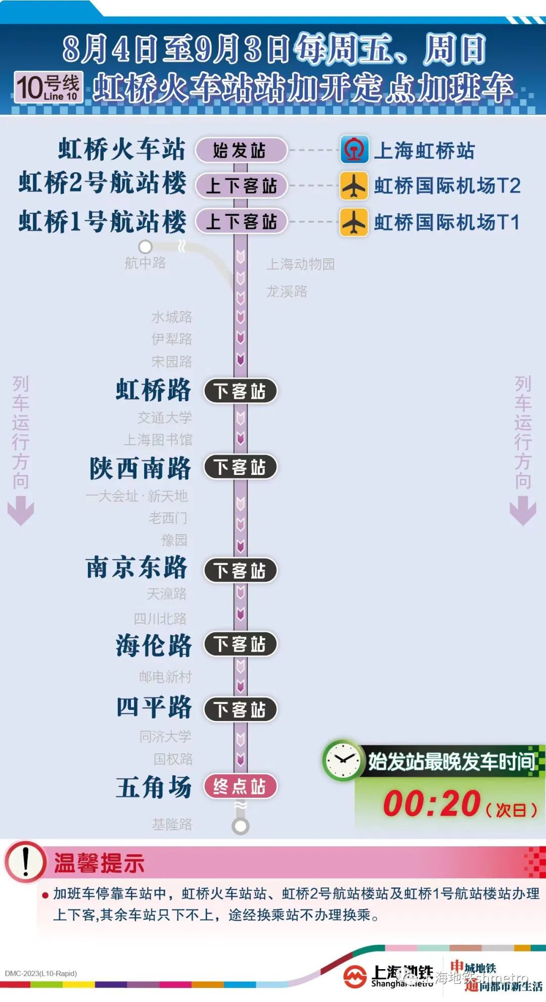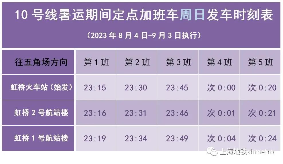 根据计划,8月4日至9月3日,10号线在每周五延时末班车后,再加开2班定点加班车,虹桥火车站站发点为0:05、0:20。虹桥火车站站、虹桥2号航站楼站、虹桥1号航站楼站发车时刻见下表。