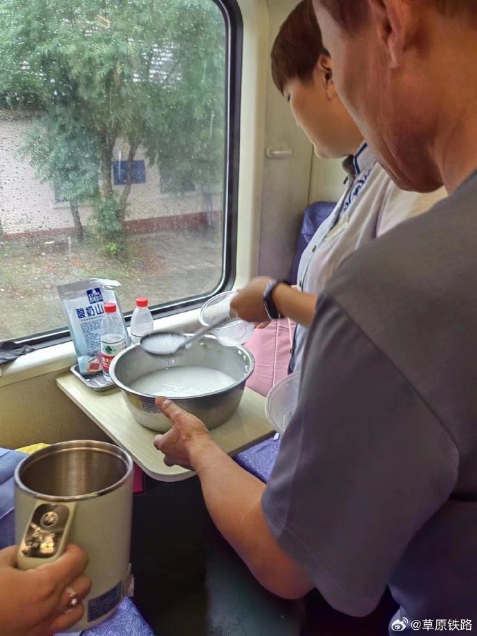 K396次列车工作人员把餐车仅剩的两袋大米熬成粥,送到旅客面前。 @草原铁路 图