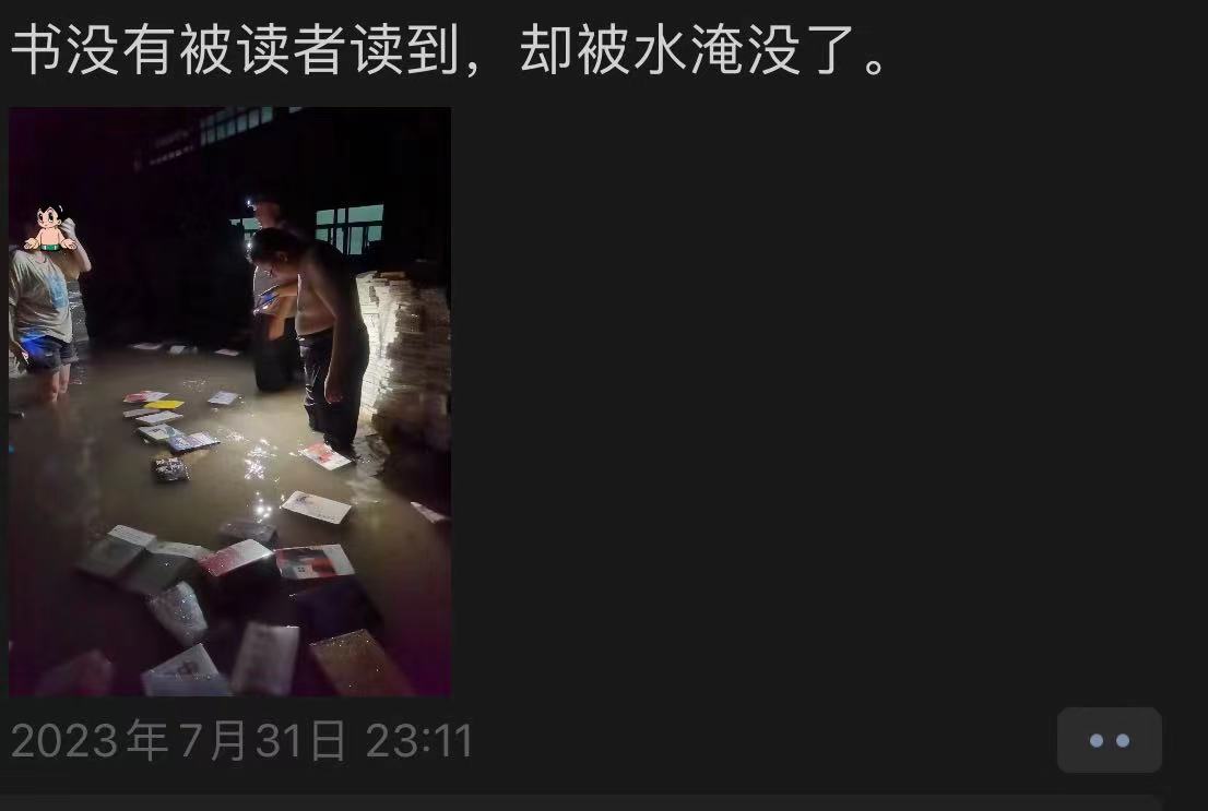 在他们的微信朋友圈,有人发了张同行站在水里低头看着泡在洪水里漂浮的书籍的照片,配文:书没有被读者读到,却被水淹没了。