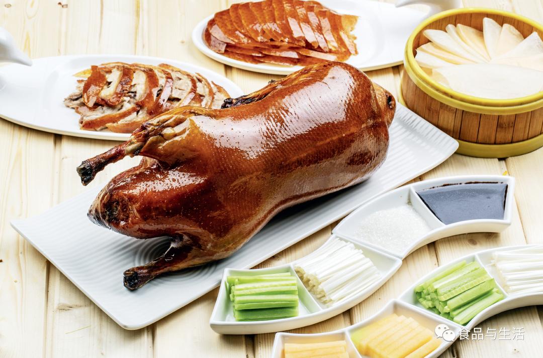 烤鸭是北京的“门面”,到北京吃烤鸭也似乎成为游客必须完成的规定动作。新鲜出炉的烤鸭体态肥美,色泽棕黄油亮,皮下油脂呼之欲出。趁厨师刚片完鸭肉的热乎劲儿,取一片薄如蝉翼的饼皮摊于掌心,以筷子蘸几缕甜面酱至其上,最后裹入鸭片和少许黄瓜丝、葱白丝及山楂条,入口酥脆香醇,美哉悠哉,这是许多外地游客脑海中的北京印象。
