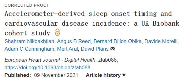 参考资料:[1] Shahram Nikbakhtian, Angus B Reed, Bernard Dillon Obika, Davide Morelli, Adam C Cunningham, Mert Aral, David Plans, Accelerometer-derive sleep onset timing and cardiovascular disease incidence: a UK Biobank cohort study, European Heart Journal - Digital Health, 2021;, ztab088, https://doi.org/10.1093/ehjdh/ztab088