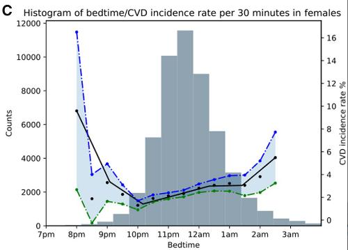 以晚10-11点睡觉作为基线,晚11-12点睡觉患心血管疾病的风险会增加12%,10点前睡觉风险增加24%,晚12点及更迟睡觉风险会增加25%。