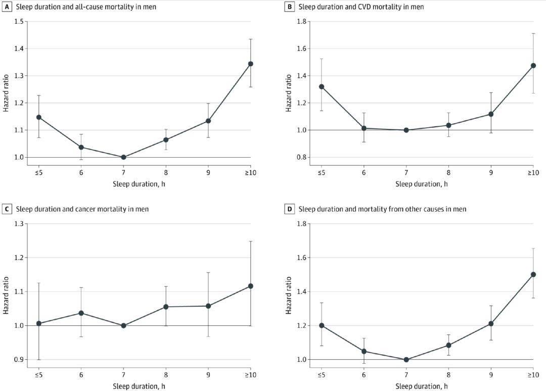 心血管疾病死亡率:在男性中,与每晚7小时睡眠相比,当睡眠时间≤5小时或≥10小时,心血管疾病的死亡风险将大幅提高;而在女性中,只要睡眠时间不足或超过7小时,心血管疾病死亡率便会有所增加,在12-49%之间。