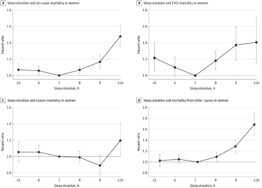 癌症死亡率:在男性中,当每晚睡眠时间超过7小时后(比如8、9或≥10小时),癌症死亡风险分别升高6%、17%和59%;而在女性中,只有睡眠时间过长(即超过10小时)会导致癌症死亡率上升23%。