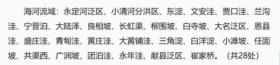 海河流域蓄滞洪区名录。图片源自《国家蓄滞洪区修订名录》其中由国家防总调度的蓄滞洪区有6处,分别为小清河分洪区、东淀、文安洼、贾口洼、团泊洼、恩县洼。其余22处由所在省级或市级防汛抗旱指挥机构调度。