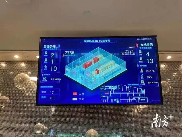 除此之外,还有深圳机场的智能洗手间,可以实时看到每个洗手间的人流情况、厕位占用情况,避免无效的排队和等待;