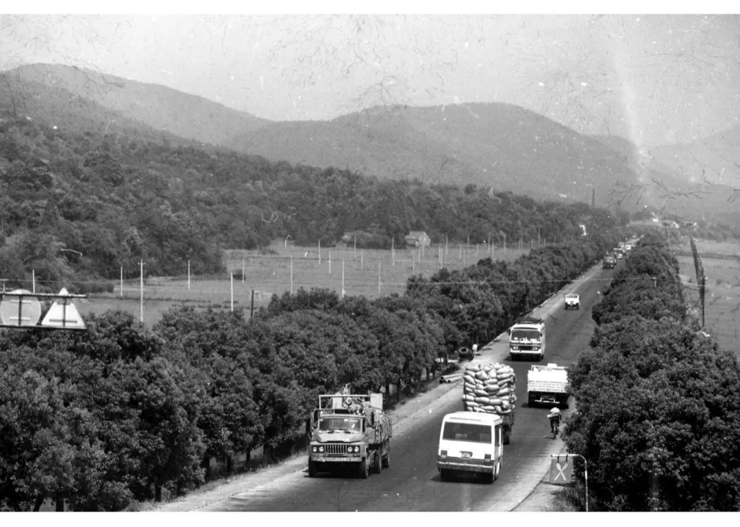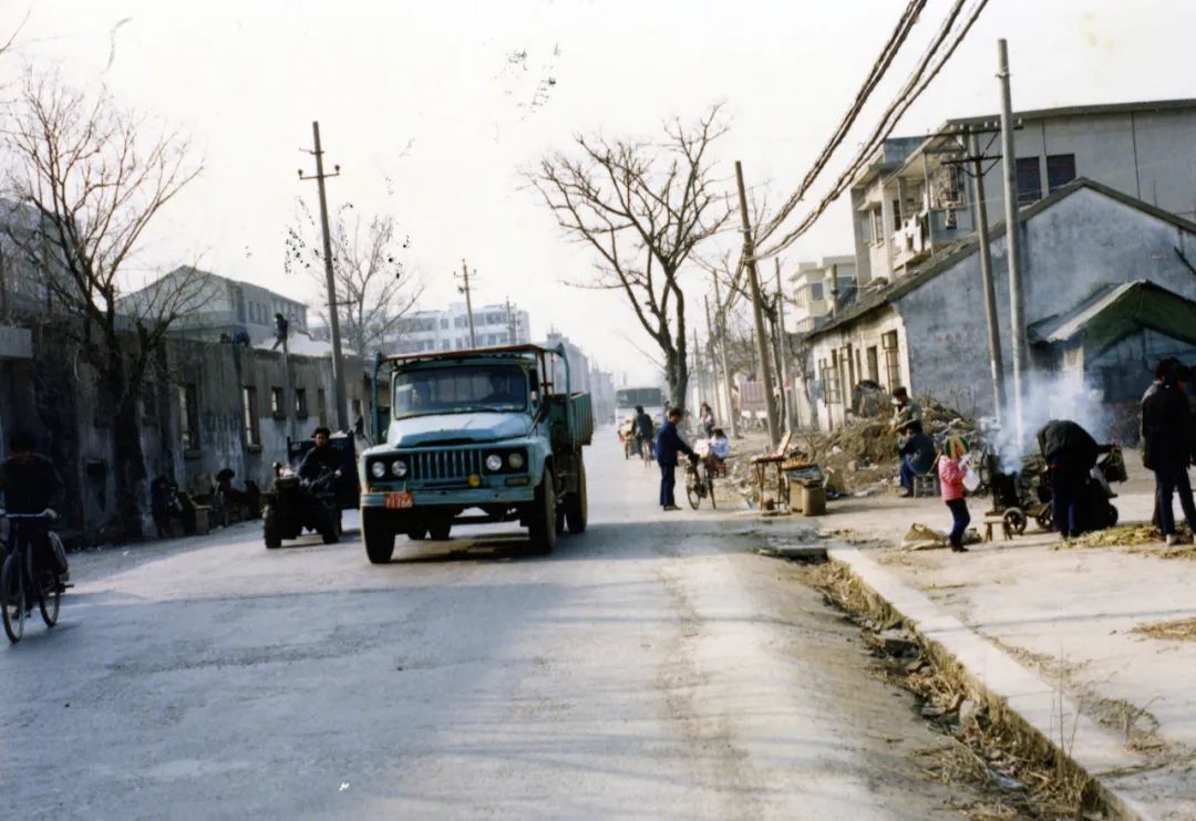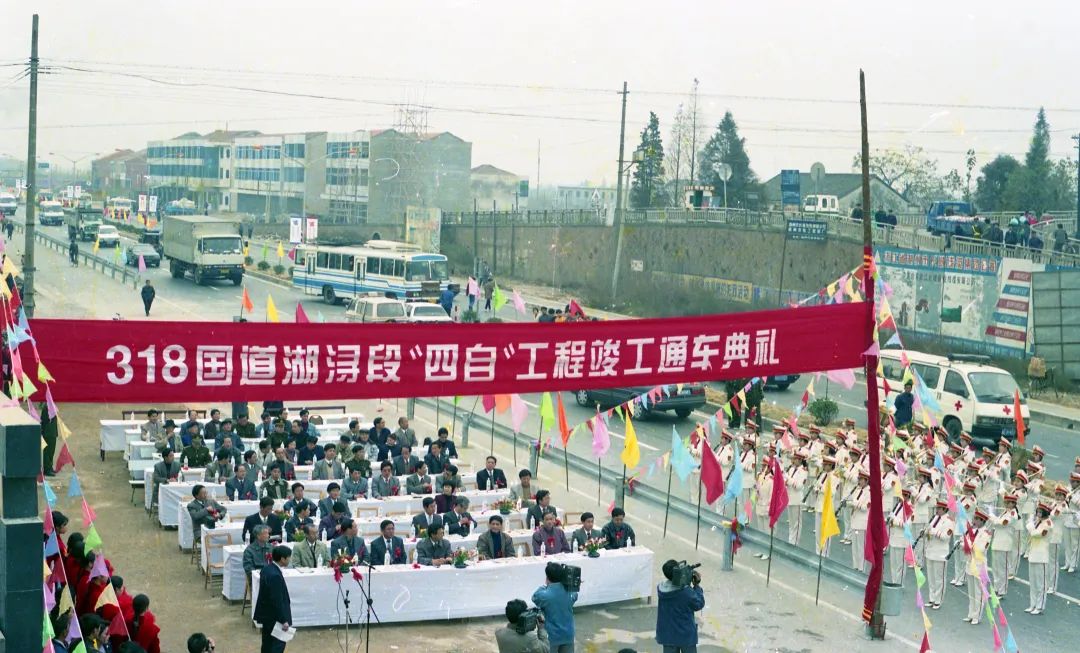 318国道改建全线通车(1995年11月28日摄)在张锦国拍摄的老照片里,1991年的318国道只有双向两车道,自行车、拖拉机、东风大货车和客车定格在没有标识线的道路上,道路的两旁就是店铺和民舍。