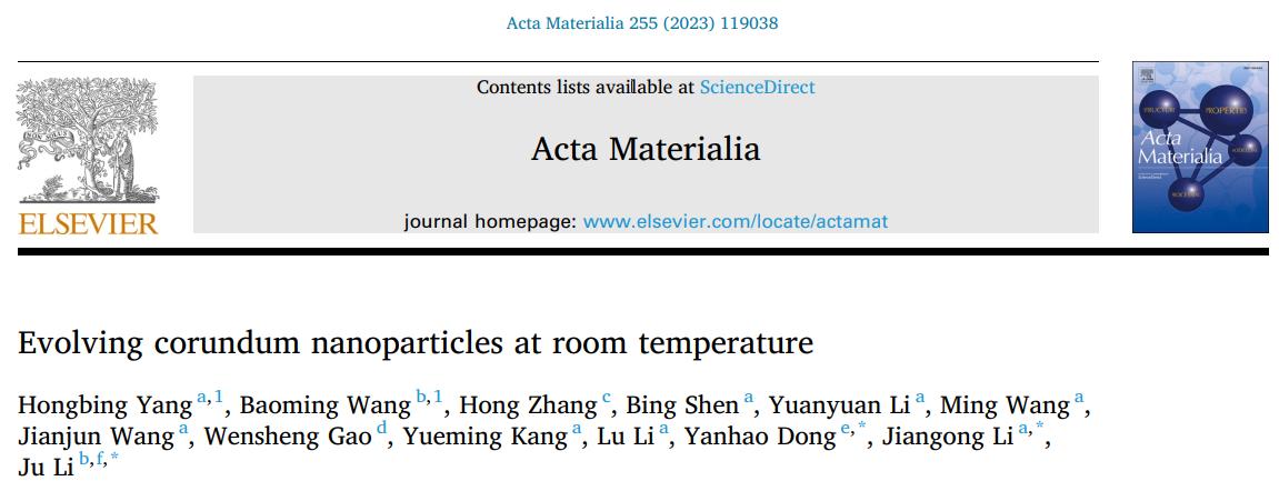 相关研究成果以“Evolving corundum nanoparticles at room temperature”为题发表在材料学科国际期刊Acta Materialia上。兰州大学博士生杨红兵和麻省理工学院王保明博士(现入职南京大学)为论文共同第一作者,兰州大学李建功教授、清华大学董岩皓助理教授和麻省理工学院李巨教授为论文共同通讯作者。论文合作者还包括兰州大学张宏博士、高文生博士、李璐博士及博士生申兵、李元元、康月明和硕士生王明、王建军。