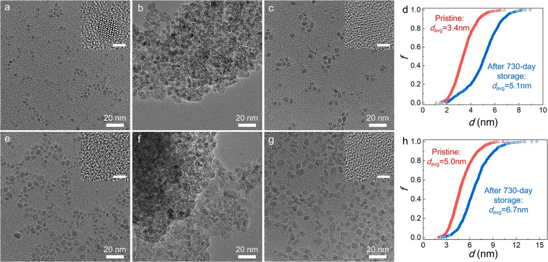 图1.两批刚玉纳米颗粒存放前(a、e)、室温存放730天未经酸腐蚀处理(b、f)和经过室温酸腐蚀处理后(c、g)的TEM照片以及尺寸分布图(d、h)。室温酸腐蚀过程不会影响本征颗粒尺寸及尺寸分布。a、c、e、g中的插图为对应刚玉纳米颗粒的HRTEM照片(标尺为2 nm)。